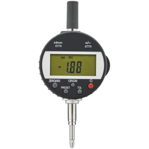Wykonanie: trzpień mocujący i trzpień pomiarowy ze stali nierdzewnej, hartowanej. Wysokość znaków wyświetlacza LCD 11 mm, element obsługi i wyświetlacz obracalny o 270°. Z wymienną końcówką pomiarową M2,5. Trzpień mocujący ? 8 mm, nakładka ochronna na końcówce pomiarowej. Z radiowym wyjściem danych i USB. Dostawa z baterią CR2032.
