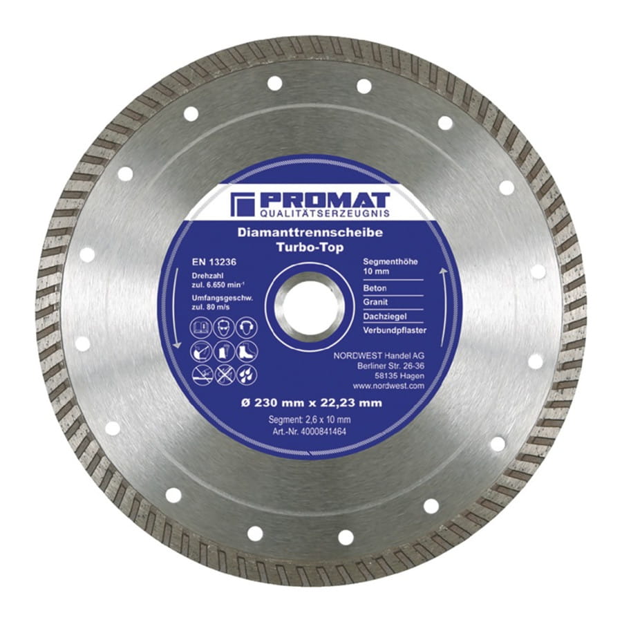 zamknięta krawędź tnąca · cięcie na mokro i sucho · stabilny, wielowarstwowy rdzeń stalowy · do usuwania zbrojonego betonu, cegieł dachowych, granitu, bruku z prefabrykatów wiązanych między sobą itd. · wysokość segmentu 10 mm
