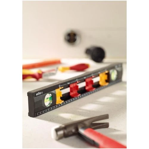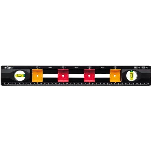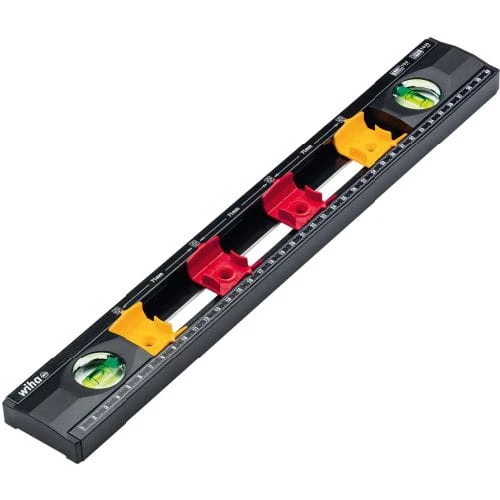 Wykonanie: z aluminium. Nadrukowana podziałka milimetrowa i obudowa przelotowa zapewniająca nieprzerwane oznaczanie linii. Umożliwia wykonanie 4 znaczników w standardowej odległości 71 mm zgodnie z DIN 49075, zmienna regulacja. Z jedną libellą poziomą i jedną libellą pionową.