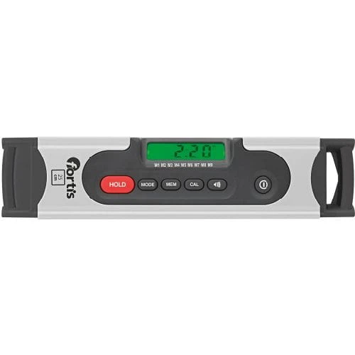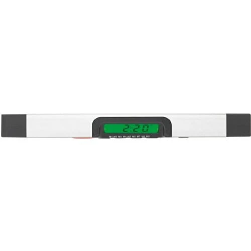 Wykonanie: profil prostokątny z metalu lekkiego, z 2 frezowanymi powierzchniami pomiarowymi i zaślepkami pochłaniającymi wstrząsy. Wyświetlacz LCD 45° z podświetleniem, wskazania w stopniach, procentach i mm/m. Sygnał akustyczny przy 0°, 45° i 90°. Funkcja hold i mode. Pamięć 9 wyników. Funkcja zerowania i ponownej kalibracji. Dokładność pomiaru modułu elektronicznego dla 0° i 90°: 0,05°, w pozostałych przypadkach 0,1°.