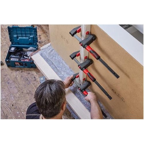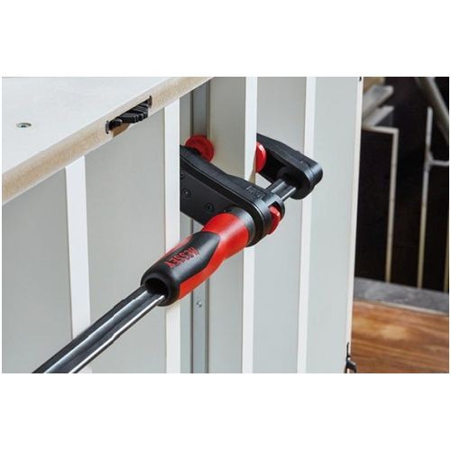 Wykonanie: szyna ze stali specjalnej, ramię stałe i ruchome z poliamidu odpornego na uderzenia i pęknięcia. Przekładnia umożliwia regulację rozpiętości poprzez obrót rękojeści na szynie poza zakresem mocowania . Płytka dociskowa ramienia stałego wyposażona w pryzmę krzyżową do mocowania elementów okrągłych, spiczastych i kątowych. Z przyciskiem do szybkiego przesuwania ramienia ruchomego. Z 2-komponentową rękojeścią z tworzywa sztucznego oraz ruchomą płaską płytką dociskową.