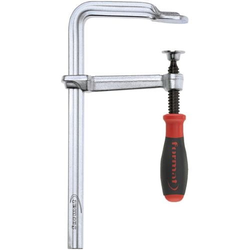Wykonanie: z 2-komponentową rękojeścią z tworzywa sztucznego z dużą, ergonomiczną, miękką strefą zapewniającą lepszy chwyt. szyna, ramię stałe i płytka dociskowa wykonane jako jeden element ze statycznie zoptymalizowanego, ciągnionego na zimno profilu stalowego. Ramię ruchome ze stali ulepszonej cieplnie, odkuwane i galwanicznie cynkowane. Proste wrzeciono z walcowatym, umocnionym zgniotem i oksydowanym gwintem trapezowym i z ruchomą płytą dociskową.