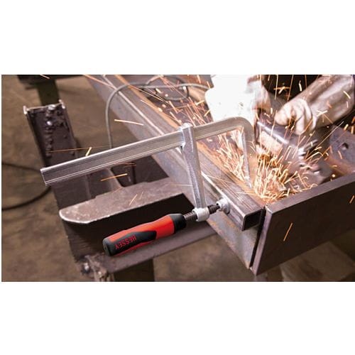 Wykonanie: z ergonomiczną, 2-komponentową rękojeścią z tworzywa sztucznego. O 20 % większa siła mocowania na obrót wrzeciona dzięki szynie o zoptymalizowanym profilu. Maksymalne bezpieczeństwo dzięki przeniesieniu siły na ramię ruchome w linii prostej. Od wysięgu 80 mm płytki obrotowe z możliwością wymiany bez użycia narzędzi. szyna, ramię stałe i płytka dociskowa wykonane jako jeden element ze statycznie zoptymalizowanego, ciągnionego na zimno profilu stalowego. Ramię ruchome ze stali ulepszonej cieplnie, kute, galwanicznie ocynkowane, lekko pracujące wrzeciono z walcowanym, hartowanym, czernionym gwintem trapezowym i z ruchomą płytką dociskową.