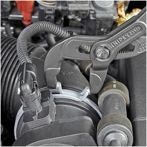Obrotowe, uniwersalne szczęki umożliwiają pewne chwytanie opasek zaciskowych w każdej pozycji. Do zakładania opasek zaciskowych standardowych, przeznaczonych do wąskich przestrzeni i drucianych oraz opasek z taśmy sprężynowej o maks. wymiarach nominalnych 70 mm.