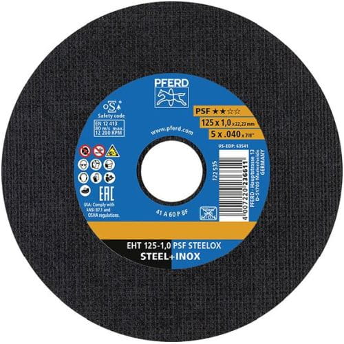 Wykonanie: korund (A), spoiwo z żywicy syntetycznej wzmacniane włóknami, zapewniające bardzo długą żywotność i wysoką wydajność cięcia. Bez dodatku wypełniaczy zawierających związki żelaza, chloru i siarki. Otwór znormalizowany 22, 23 mm.
