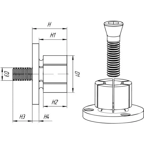 Wykonanie: ze stali konstrukcyjnej, z hartowaną i powlekaną śrubą mocującą. Średnica kołnierza mocującego jest koncentryczna względem średnicy mocowania, dzięki czemu osiąga się wysoką powtarzalność elementów.