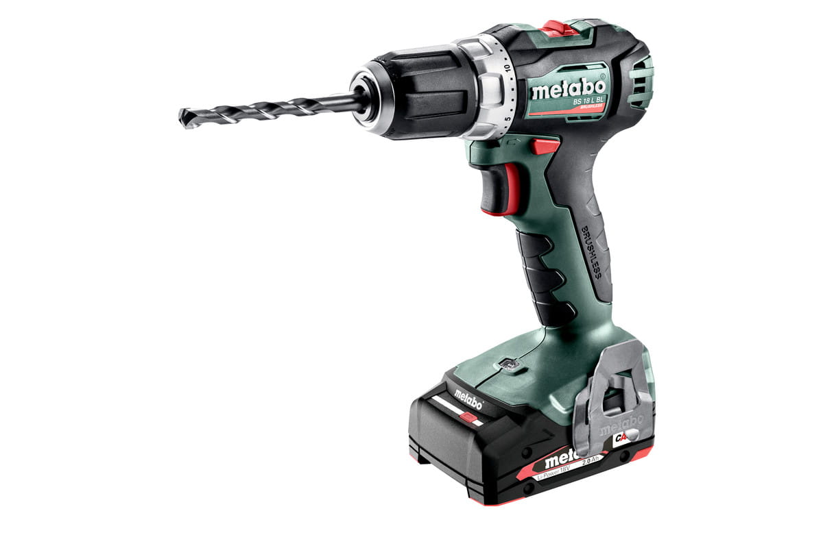 Szybkomocujący uchwyt wiertarski, Zaczep do paska i magazynek na bity, 2 akumulatory Li-Power (18 V/2,0 Ah), Ładowarka SC 30, metaBOX 145