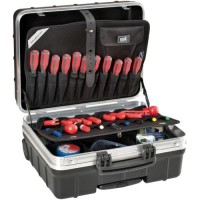 Wykonanie: z odpornego na uderzenia polipropylenu koloru czarnego, z wytrzymałymi, wyjmowanymi tablicami narzędziowymi i stabilnym uchwytem do przenoszenia,blokowanym, ergonomicznym uchwytem teleskopowym i lekko pracującymi kółkami. Wysokość części spodniej 120 mm, z możliwością dowolnego podziału wnętrza. Wytrzymałość obciążeniowa walizki do 25 kg, podwójna rama z aluminium. Bardzo stabilna. Zamykana na dwa klawiszowe zamki naciskowe. Dostawa bez zawartości.