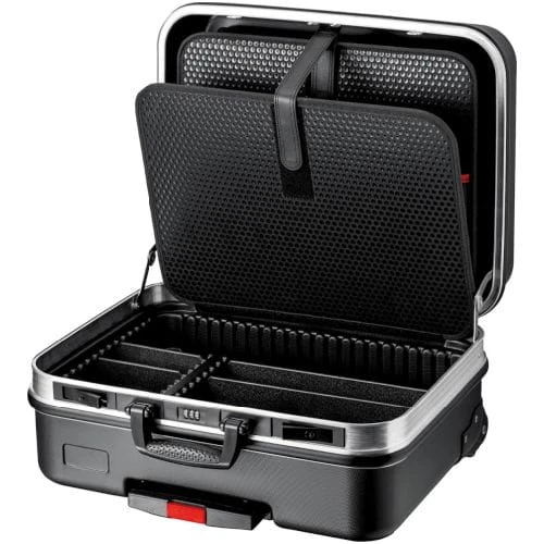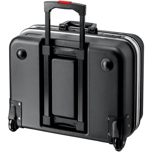 Wykonanie: z odpornego na zużycie i wilgoć tworzywa sztucznego ABS w kolorze czarnym, z wytrzymałymi tablicami narzędziowymi ze specjalnego tworzywa sztucznego odpornego na zarysowania, odkształcenia i deformacje, działanie wilgoci, smarów i chemikaliów, stabilny, 3-segmentowy uchwyt teleskopowy, powlekany proszkowo i lekko toczące się kółka. Wysokość części spodniej 70 mm z możliwością dowolnego podziału wnętrza. Z ocynkowanymi metalowymi zawiasami, wytrzymałość obciążeniowa walizki do 20 kg, obwodowa rama z aluminium. Bardzo stabilna, ze ślizgaczami zabezpieczającym spód. Zamykana na 2 klawiszowe zamki naciskowe i zamek szyfrowy z kodem 3-cyfrowym.