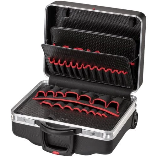 Wykonanie: z mocnego, odpornego na temperaturę, zarysowania i pękanie tworzywa X-ABS koloru czarnego, z wytrzymałymi tablicami narzędziowymi z materiału Con-Pearl® odpornego na zarysowania, odkształcenia i deformacje, działanie wilgoci, smarów i chemikaliów, stabilny, 4-segmentowy uchwyt teleskopowy, powlekany proszkowo i bardzo szerokie, gumowane kółka. Bardzo stabilna dzięki szerokiemu rozstawowi kół. Z ocynkowanymi i blokowanymi zawiasami metalowymi, wytrzymałość obciążeniowa walizki do 30 kg, podwójna rama aluminiowa. Zamykana na 2 klawiszowe zamki naciskowe. Walizka przystosowana do przewozu samolotem. Dostawa bez zawartości.