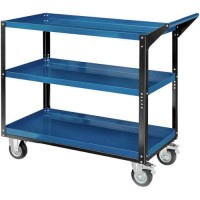 Wykonanie: stabilna konstrukcja z blachy stalowej z 3 półkami, środkowa półka z regulowaną wysokością. Z jednej strony uchwyt do pchania i skręcania. Z 2 kółkami tocznymi i 2 kółkami skrętnymi z hamulcem zapobiegającym toczeniu (każde o średnicy 125 mm). Powierzchnia malowana proszkowo na kolor niebieski GEDORE. Całkowita wysokość robocza 900 mm.