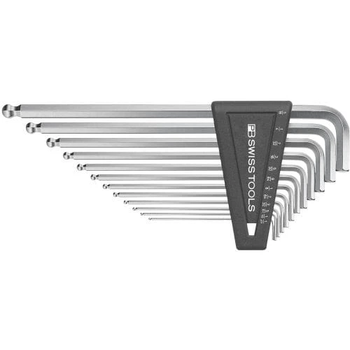 Wykonanie: DIN 911 L, ISO 2936 L. Z wysokostopowej stali sprężynowej hartowanej na wskroś, chromowanej. Z końcówką kulistą i fazowanym krótkim ramieniem. Dostawa w uchwycie.