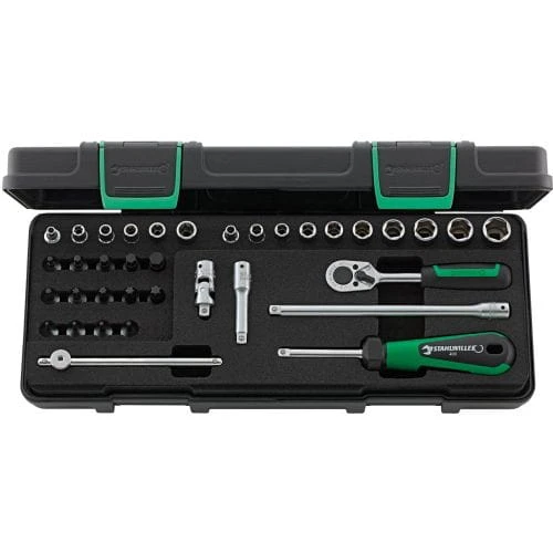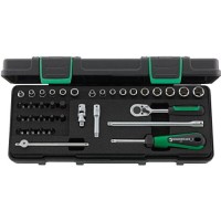 Wykonanie: narzędzia ze stali chromowej, chromowane. Końcówki wymienne klucza nasadowego ze stali wysokowydajnej HPQ®. Narzędzia bezpiecznie przechowywane we wkładce piankowej. Dostawa w kasecie z tworzywa sztucznego ABS przeznaczonej do układania w stosy.