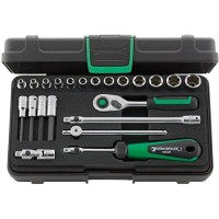 Wykonanie: narzędzia ze stali chromowej, chromowane. Końcówki wymienne klucza nasadowego ze stali wysokowydajnej HPQ®. Narzędzia bezpiecznie przechowywane we wkładce piankowej. Dostawa w kasecie z tworzywa sztucznego ABS przeznaczonej do układania w stosy.