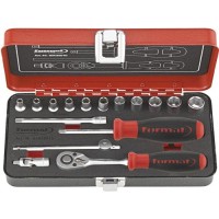 Wykonanie: narzędzia ze stali chromowo-wanadowej, chromowane, końcówki wymienne klucza nasadowego z radełkowaną powierzchnią ułatwiająca chwycenie, gniazda 6- i 4-kątne z zaokrąglonymi narożami zabezpieczającymi łeb śruby i zabierak. Grzechotka dwukierunkowa z przełącznikiem dźwigniowym, 72 zęby, kąt powrotu zapadki 5°, rękojeść 2-komponentowa z tworzywa sztucznego. Dostarczane w stabilnej metalowej kasecie ze schematem rozmieszczenia narzędzi w pokrywie. Narzędzia są umieszczone w 2-kolorowym wkładzie piankowym, gdzie natychmiast zauważa się ich brak.