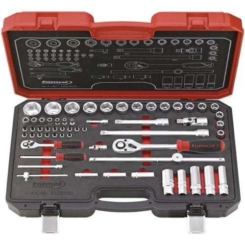 Wykonanie: narzędzia ze stali chromowo-wanadowej, chromowane, końcówki wymienne klucza nasadowego z radełkowaną powierzchnią ułatwiająca chwycenie, gniazda 6- i 4-kątne z zaokrąglonymi narożami zabezpieczającymi łeb śruby i zabierak. Grzechotka dwukierunkowa z przełącznikiem dźwigniowym, 72 zęby, kąt powrotu zapadki 5°, rękojeść 2-komponentowa z tworzywa sztucznego. Dostawa w wytrzymałej, czerwono-czarnej kasecie z tworzywa sztucznego, ze schematem rozmieszczenia narzędzi w pokrywie. Narzędzia są umieszczone w 2-kolorowym wkładzie piankowym, gdzie miejsca po brakujących narzędziach są dobrze widoczne.