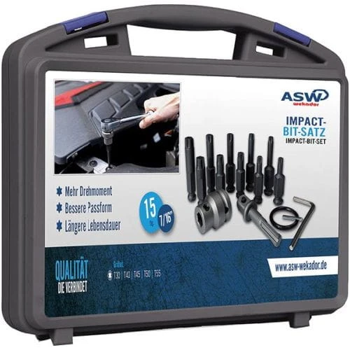 Wykonanie: DIN 3126. Ze stali chromowo-molibdenowej, fosforanowane manganowo. Możliwość mocowania bitów 7/16" za pomocą adaptera 1/2". Prosta i ekonomiczna wymiana bitu w przypadku uszkodzenia. Dostawa w odpornej na uderzenia walizce z piankową wkładką.